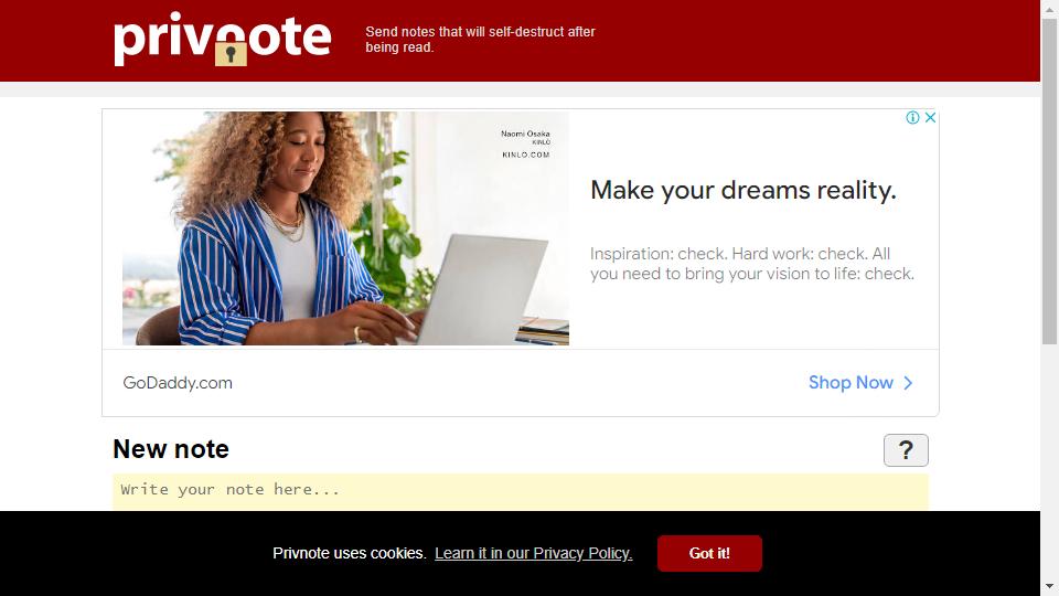 私密便籤網(Privnote)美國一個發送閱讀後自動銷燬的私密便籤網站,無需註冊即可使用——輸入要發送的信息即可得到一個鏈接,然後將此鏈接email給你的朋友,當對方閱讀後你就會得到通報,閱讀後該信息可自動銷燬。