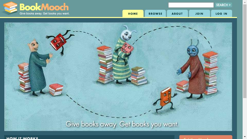 BookMooch是一個圖書交換網站,公司設在美國加利福尼亞州。用戶可以將自己不需要的圖書信息上傳到網站,當有人回覆想要這本書的時候,你必須儘快把這本書郵寄出去,然後網站會給你加上相應的點數,用這個點數,你就可以去換別人的書了。