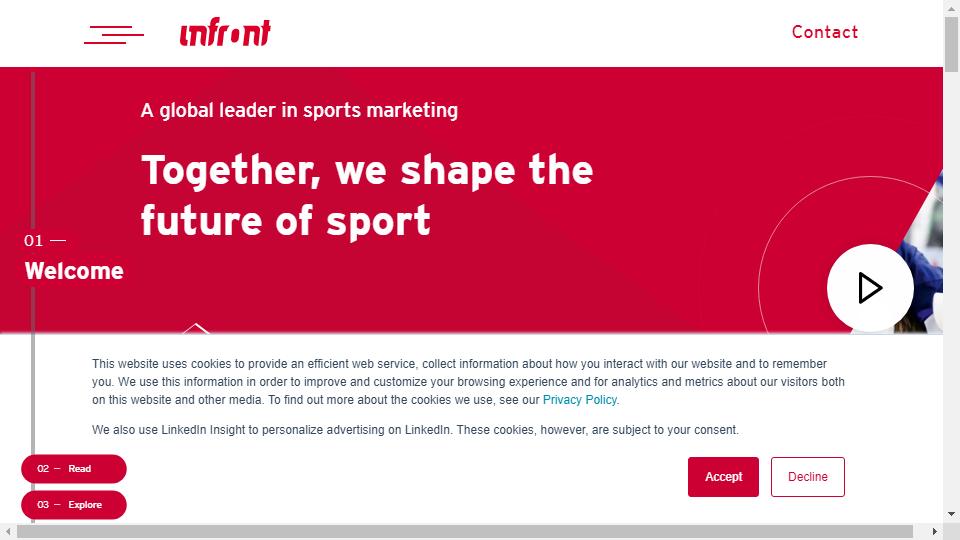 盈方體育傳媒集團(Infront Sports & Media)是全球最大的體育營銷公司之一,成立於2002年,總部位於瑞士,萬達集團控股68.2%,主要從事體育賽事開發和運作,尤其是足球賽事的運作。