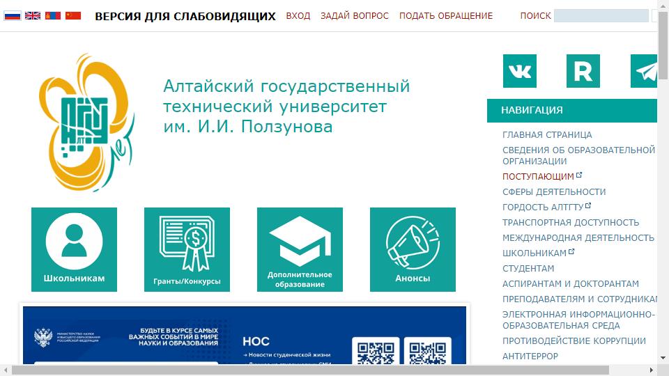 阿爾泰國立技術大學(Алтайский государственный технический университет)俄羅斯最大的大學之一,於1943年成立,位於俄羅斯南部風景優美的巴爾瑙爾市,提供學士、專家、碩士、副博士、博士等專業課程,主要專業有建築、建築環境設計、設計、環境保護、計算機系統和網絡、計算機輔助設計等。