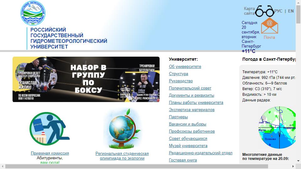 俄羅斯國立水文氣象大學(彼得堡)全球第一所水文氣象方面的高等學府,於1930年創立,其前身爲莫斯科水文氣象學院,主要院系有氣象學系、水文學系、海洋學系、生態和環境物理系、經濟和人文系等。