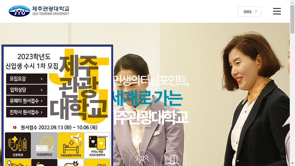 濟州觀光大學(Cheju Tourism College)韓國第一所“觀光”大學,綜合性私立大學,由韓國教育部正式認可,於1992年創立,位於韓國濟州特別自治道濟州市涯月邑和平路,設有外國語系、電腦信息系、觀光休閒體育系、烹飪烘培系、旅遊產品設計系等。
