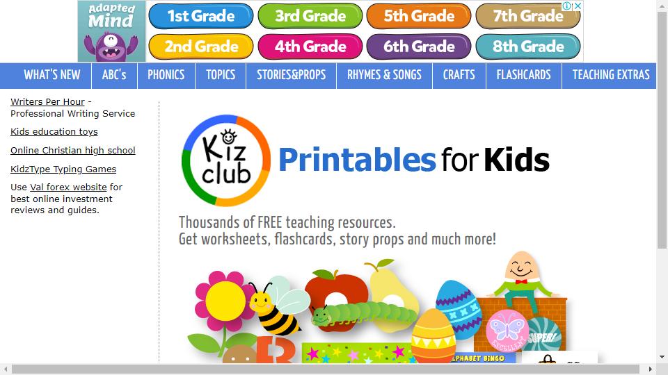 KizClub 網站是一個提供大量的免費教學主要的站點,適合於幼兒園和小學生年齡段的孩子們學習和使用,該網站提供大量的抽認卡、剪貼畫和一些可打印資源,如果你是一名英語老師可以從這裏獲取大量的教學資源。
