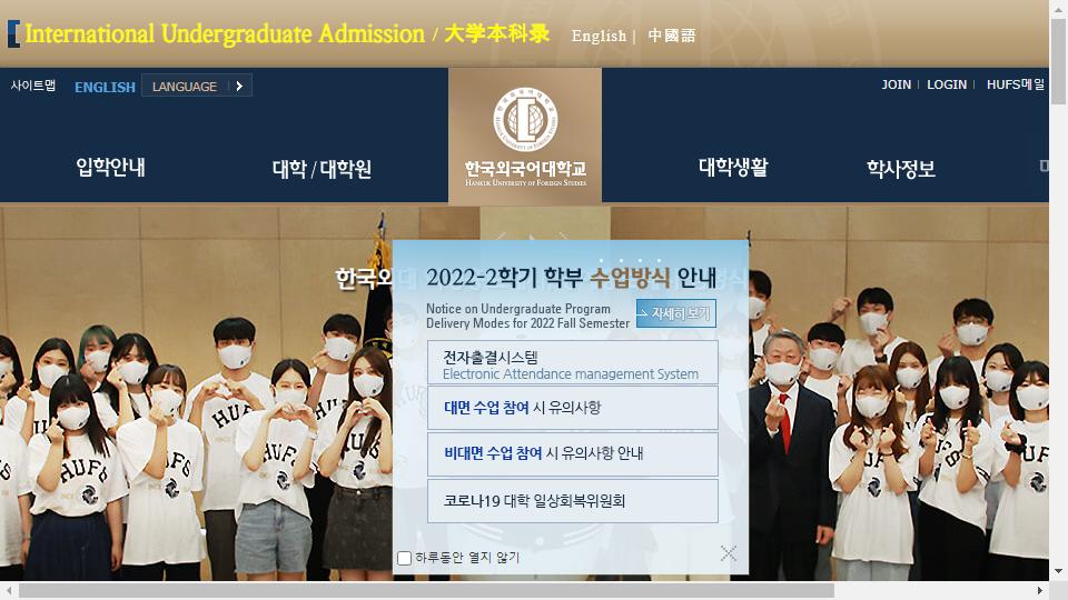 韓國外國語大學(HUFS)是韓國外國語人才的搖籃,創立於1954年,位於首爾東部。韓國外國語大學發展至今被認爲是在人文科學,社會科學及外語教學的高等教育領域中最重要的高校之一。外國語研修院也受到國家公務員和經商者們的高度評價,享有極高的聲譽。