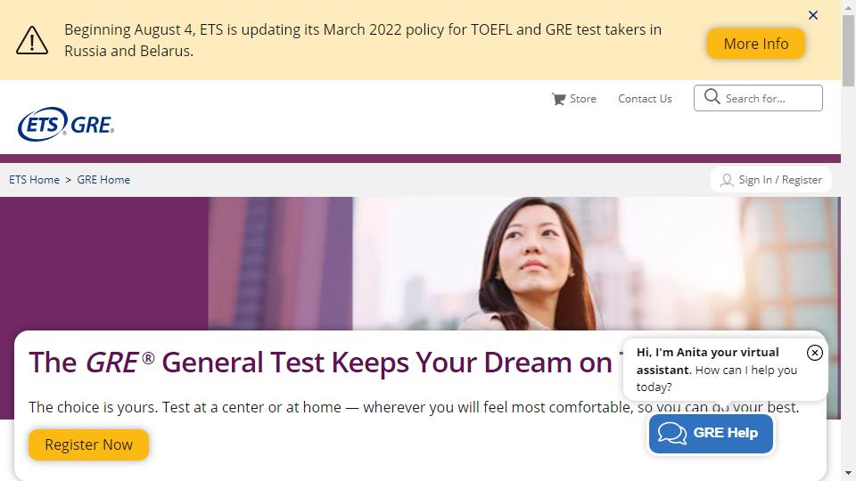 GRE(Graduate Record Examination;中文稱:美國研究生入學考試)是申請世界各地的大學各類研究生院(除管理類學院和法學院外)入學和獎學金的重要依據,由主辦,於1937年在、、、等四所大學首次舉辦。值得注意的是,申請法律或商業學研究生分別以和替代普通考試。