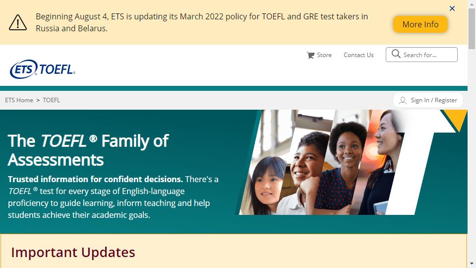 託福(TOEFL;全稱:The Test of English as a Foreign Language;檢定非英語爲母語者的英語能力考試)是全球著名大學及研究院入學和獎學金申請的重要標準,分爲pbt(紙考;120分)、cbt(機考;300分)和ibt(網考;120分)三種,考試的有效期爲兩年(從考試日期起),由主辦。2005年9月,ETS在全球推出新托福考試,即TOEFL iBT(Internet Based Test),由四部分組成——閱讀(Reading)、聽力(Listening)、口試(Speaking)、寫作(Writing)。