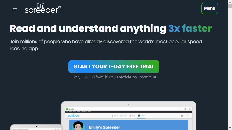 Spreeder是美國一個快速閱讀在線應用程序。用戶只需將文本文章複製到Spreeder的文本框內,並點擊play即可進行快速閱讀。該網站設置的初始閱讀速度爲300字每分鐘,速度、文本框大小、字體和顏色均可以自行設置。