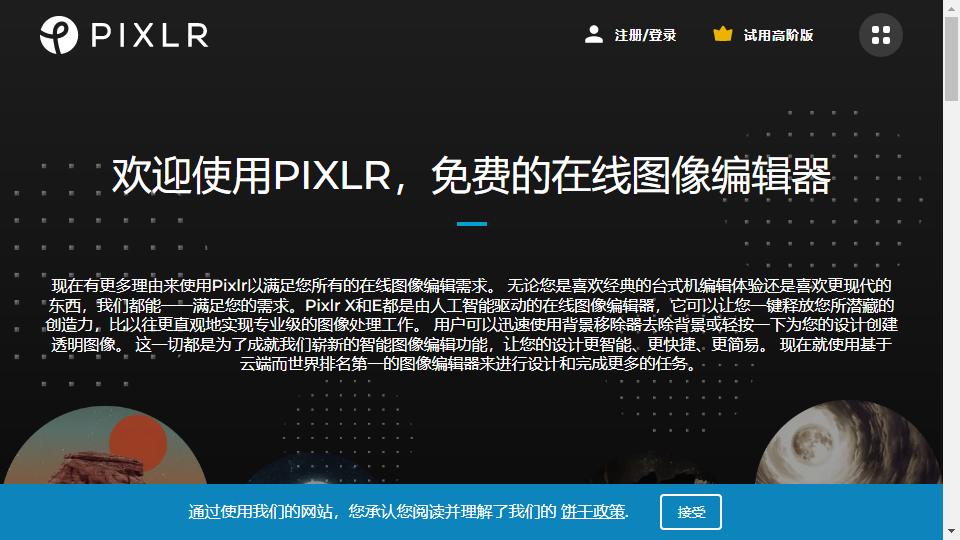 該網站爲Pixlr推出的一款免費在線ps工具,支持簡體中文在內的多種語言,且界面、工具以及功能與Photoshop等圖片處理工具相似。