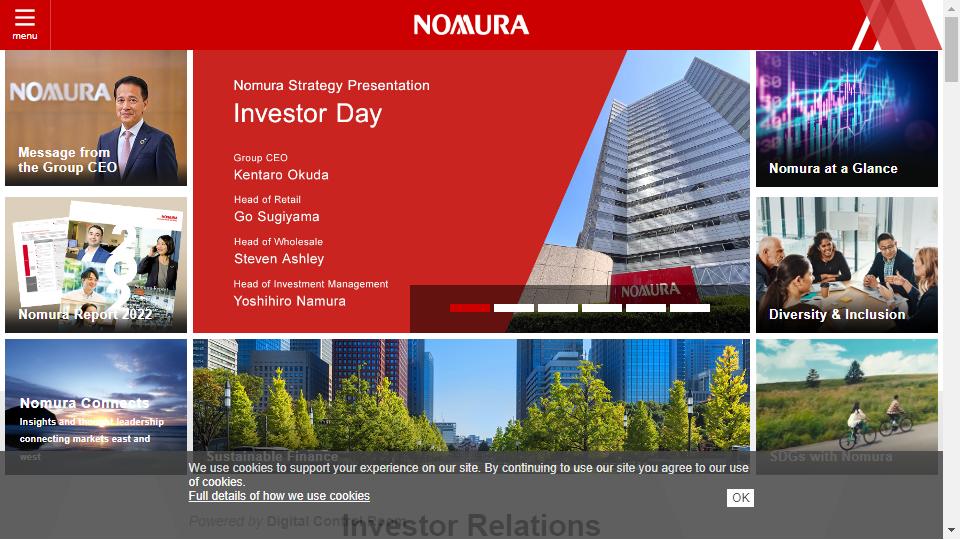 野村控股(NOMURA SECURITIES)日本最大的證券公司,其前身爲1872年設立的野村商店;後於1918年成立了野村銀行;1920年成立了專門從事債券業務的野村銀行證券部;1925年成立野村證券股份公司。